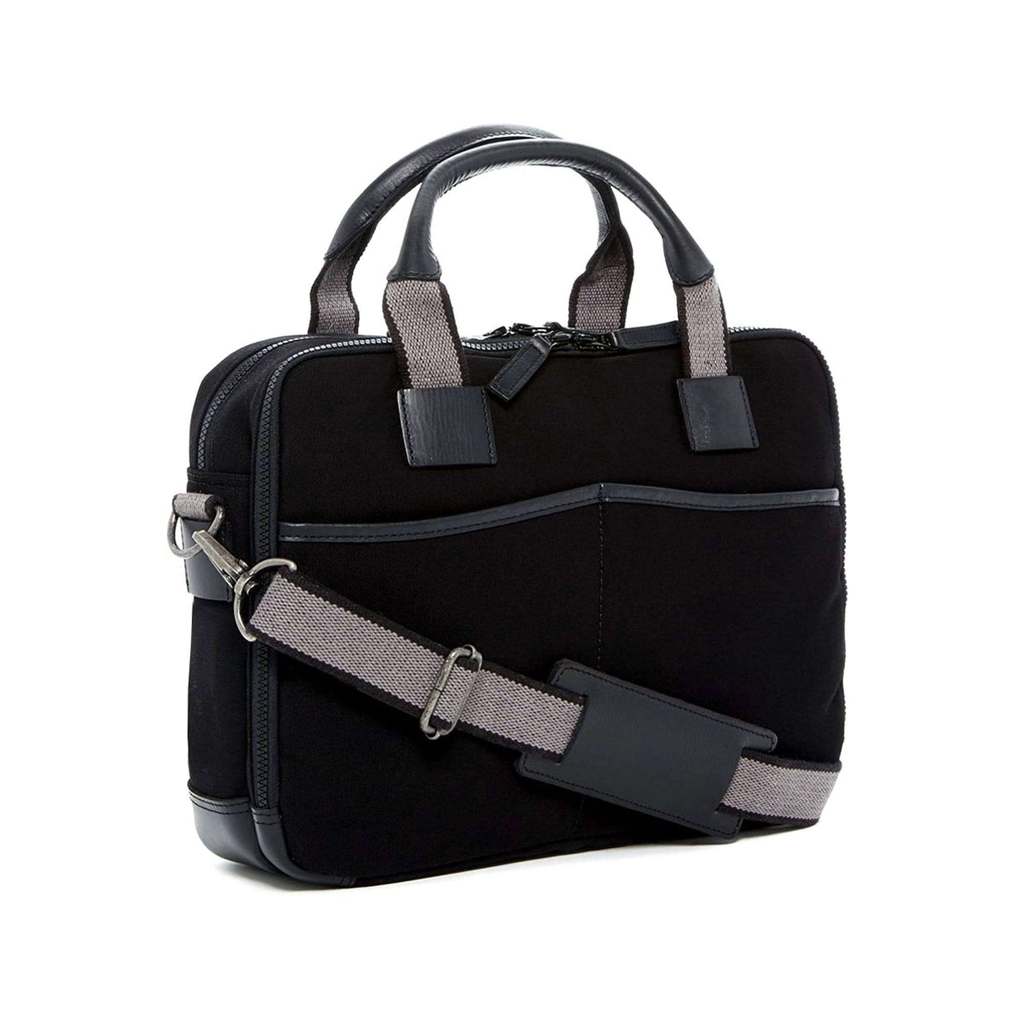 This Dual Entry Top Zip briefcase is handmade from cotton canvas trimmed with raw-edge, full-grain Buffalo hide. The briefcase has a padded compartment to hold laptops with up to 15" screens and plenty of room for files and folders. An organizer holds your mobile phone, portable hard drive, pens, and other accessories. Dual open front pockets and zippered front & back pockets offer added storage for items that you want to keep close at hand while you're on the go. Rolled handles and an adjustable shoulder strap add carrying comfort and convenience.