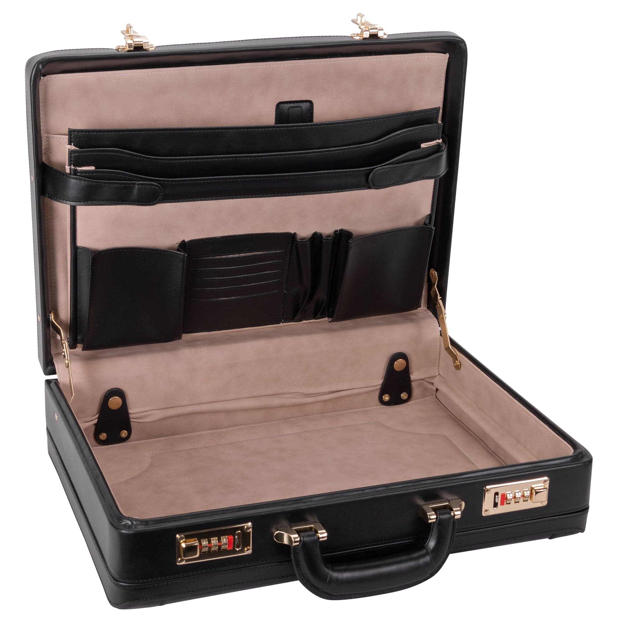 An honorable tribute to the classic briefcase with many of the original traits of the classical briefcase. A comfortable handle and lots of compartments for storage, give your outfit the twist it needs with a functional piece of the old world. A 3-digit combination lock offers elegance to this attaché’s security.