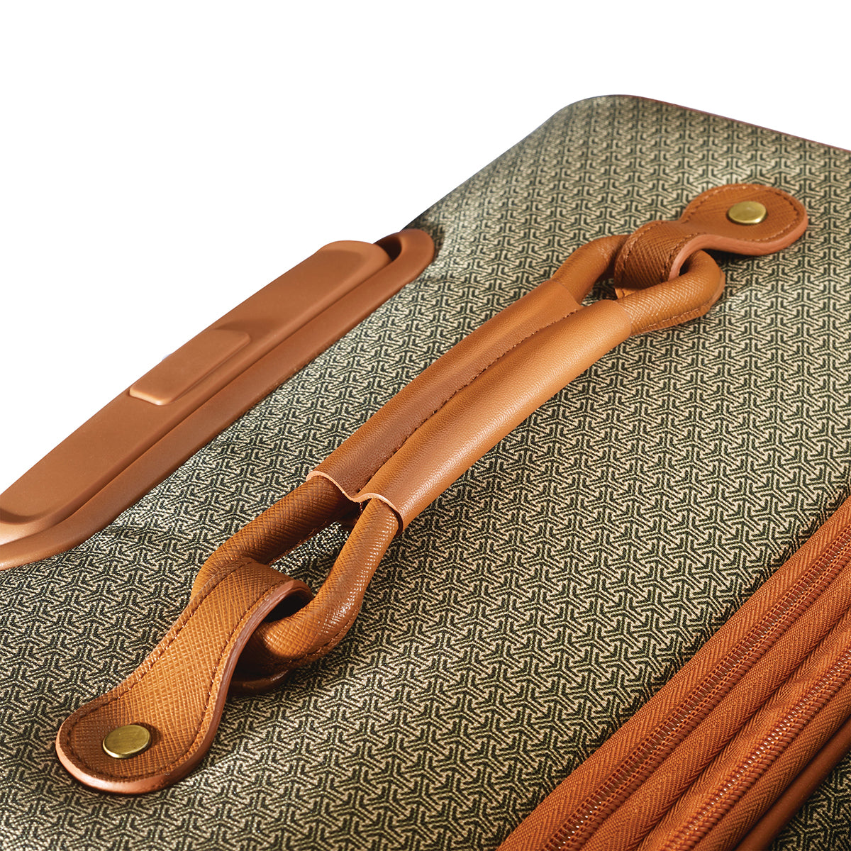 - Aluminum push button locking handle and signature figure-8 leather wrapped carry handle