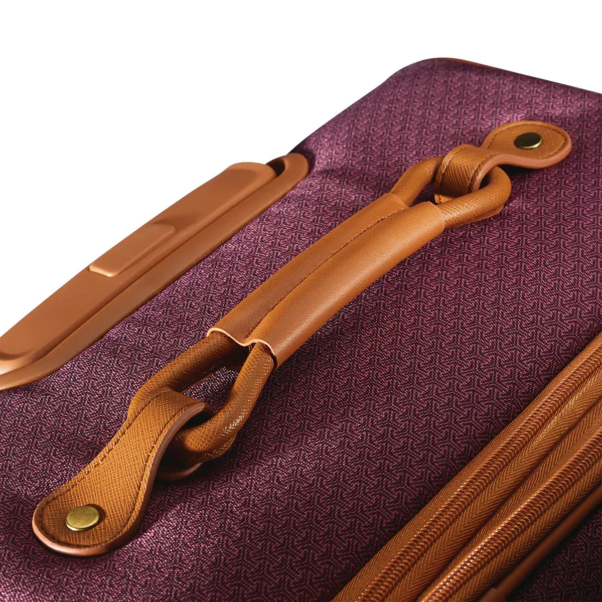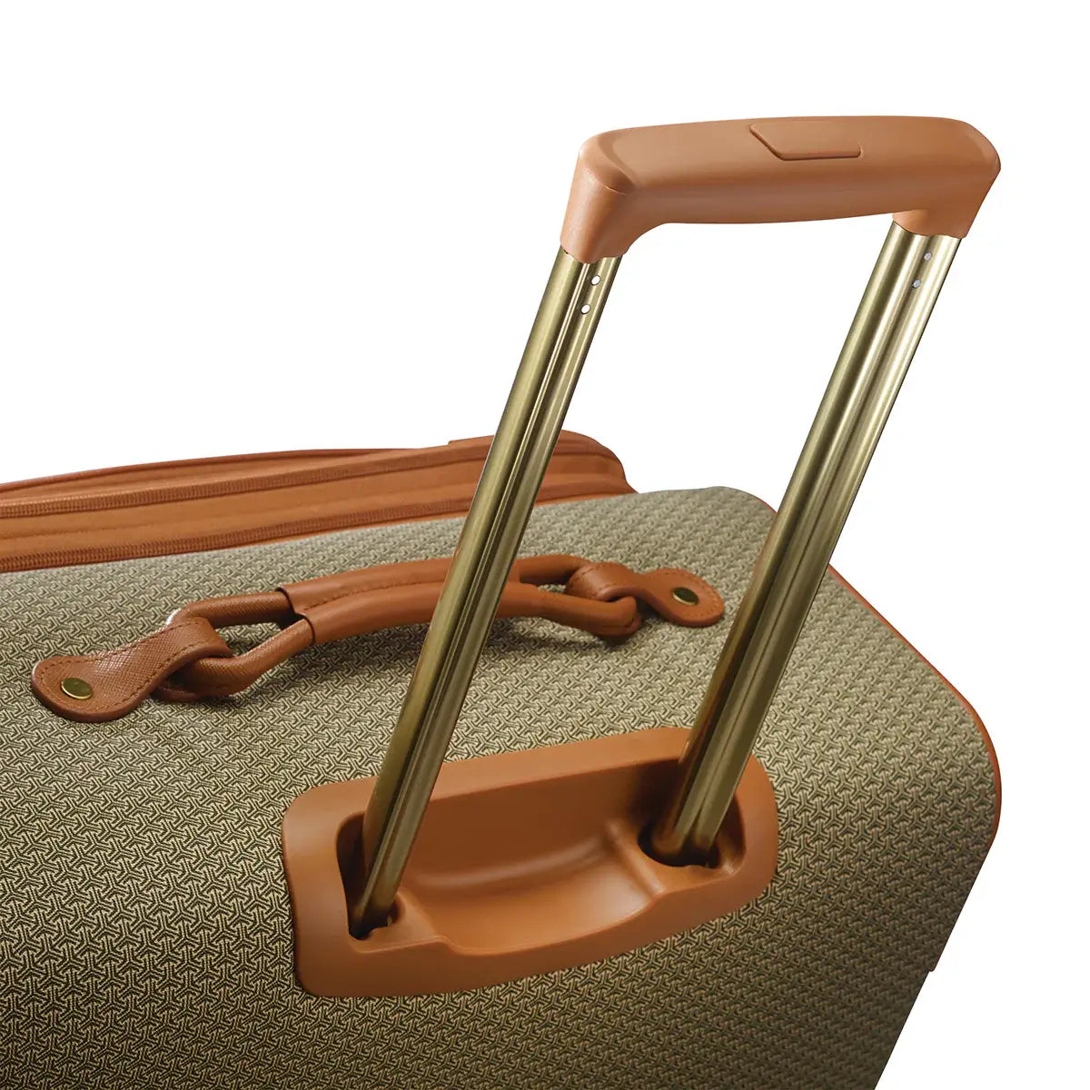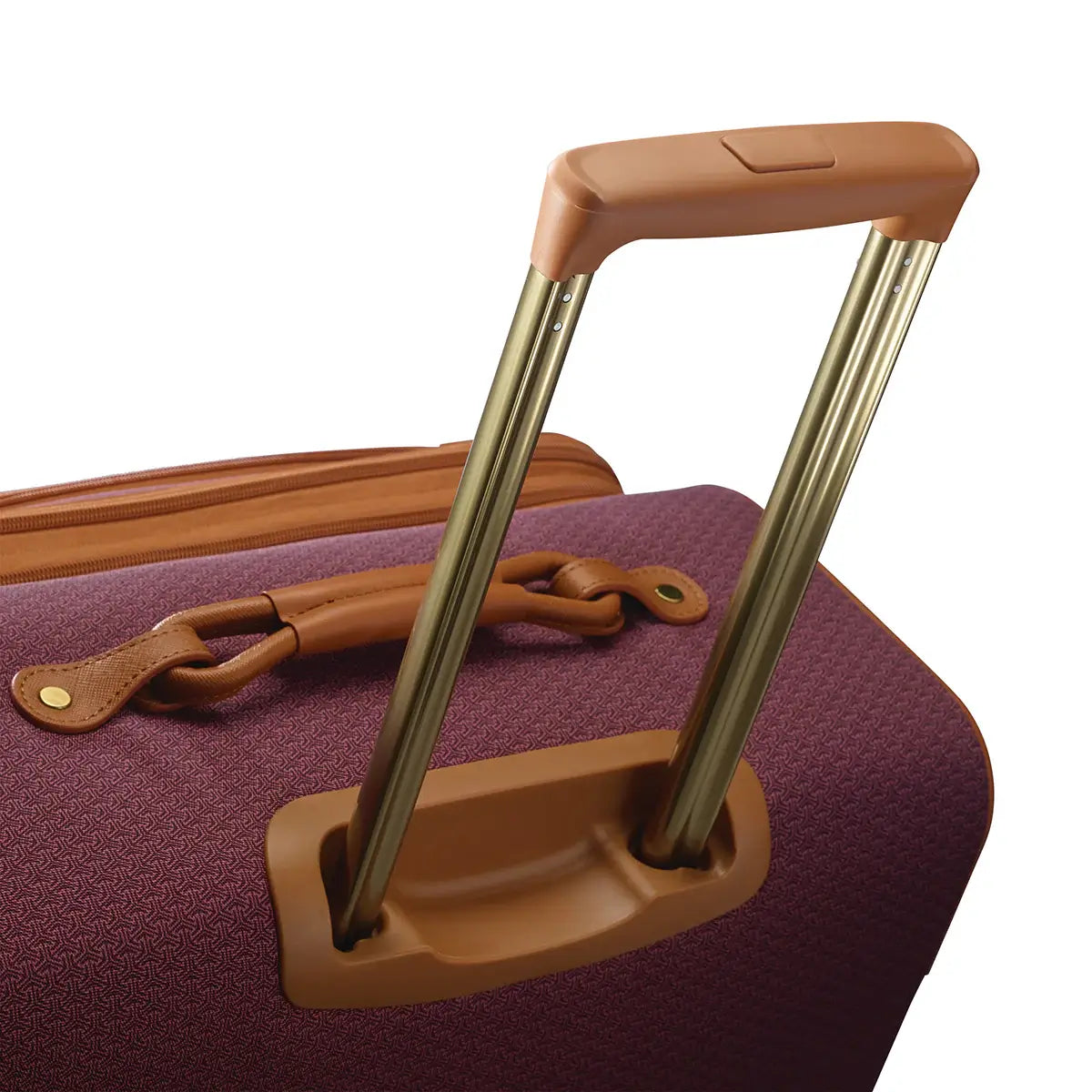 - Aluminum push button locking handle and signature figure-8 leather wrapped carry handle