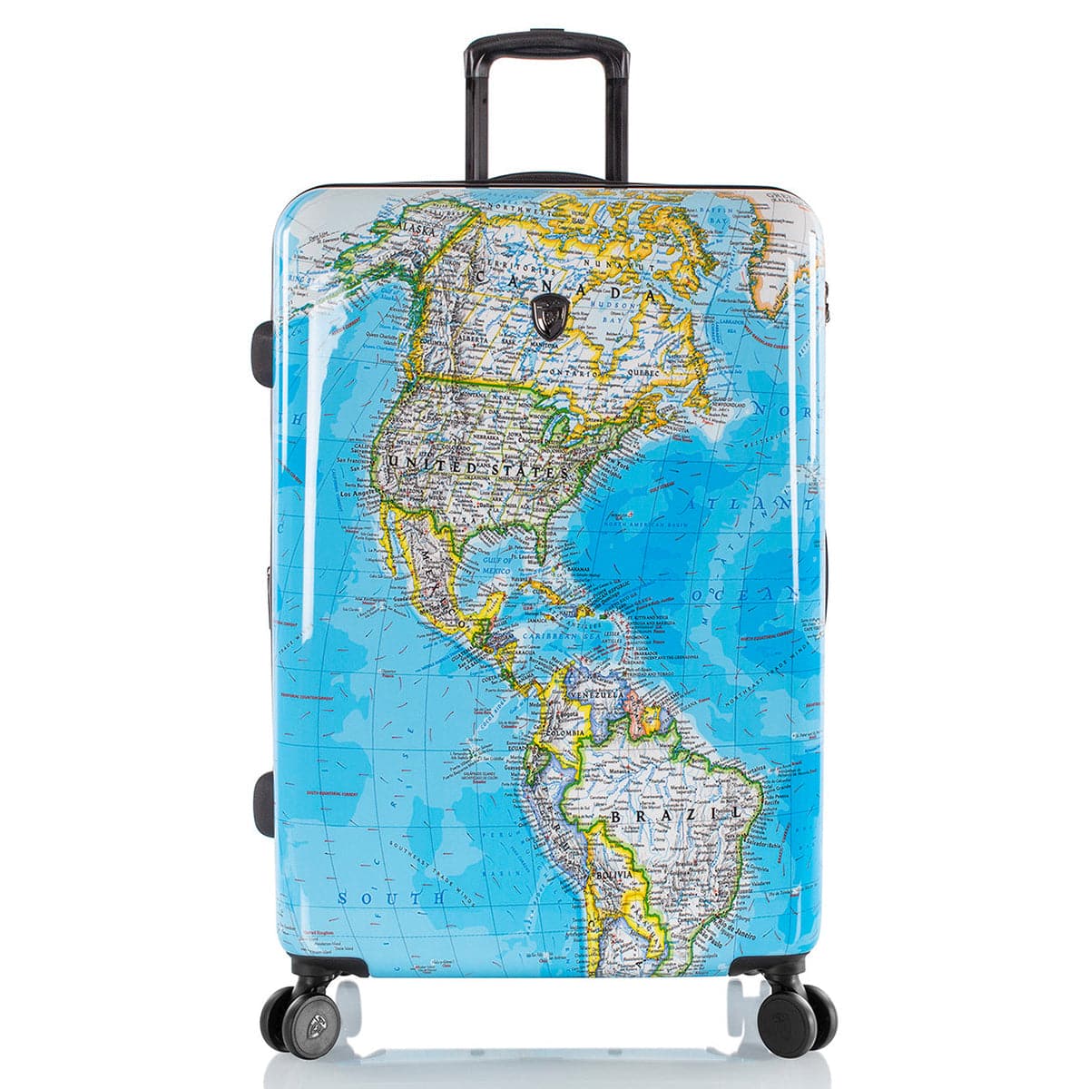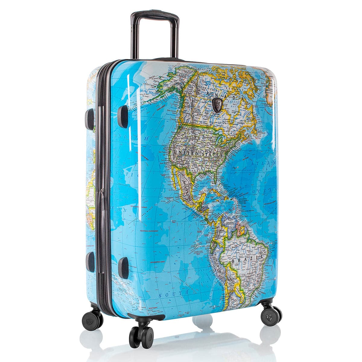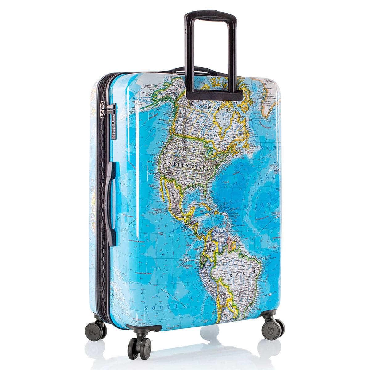 - Features a world map print