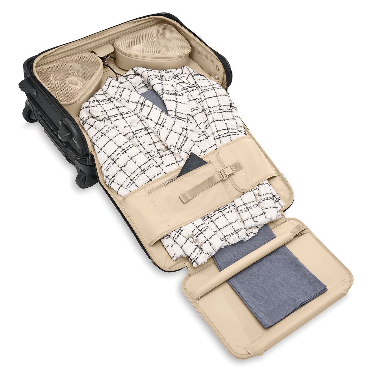 - Spacious center tie down in suiter compartment secures your attire by adding compression, reduces shifting while in transit