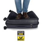 - Available in five stylish colours with a subtle textured matte finish and stylish colour-matched wheels, handles, lock, zippers and trim