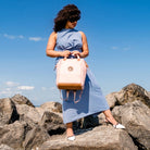 - Exterior includes two side pockets, a large zippered front pocket, and a hidden back pocket to tuck in the back straps