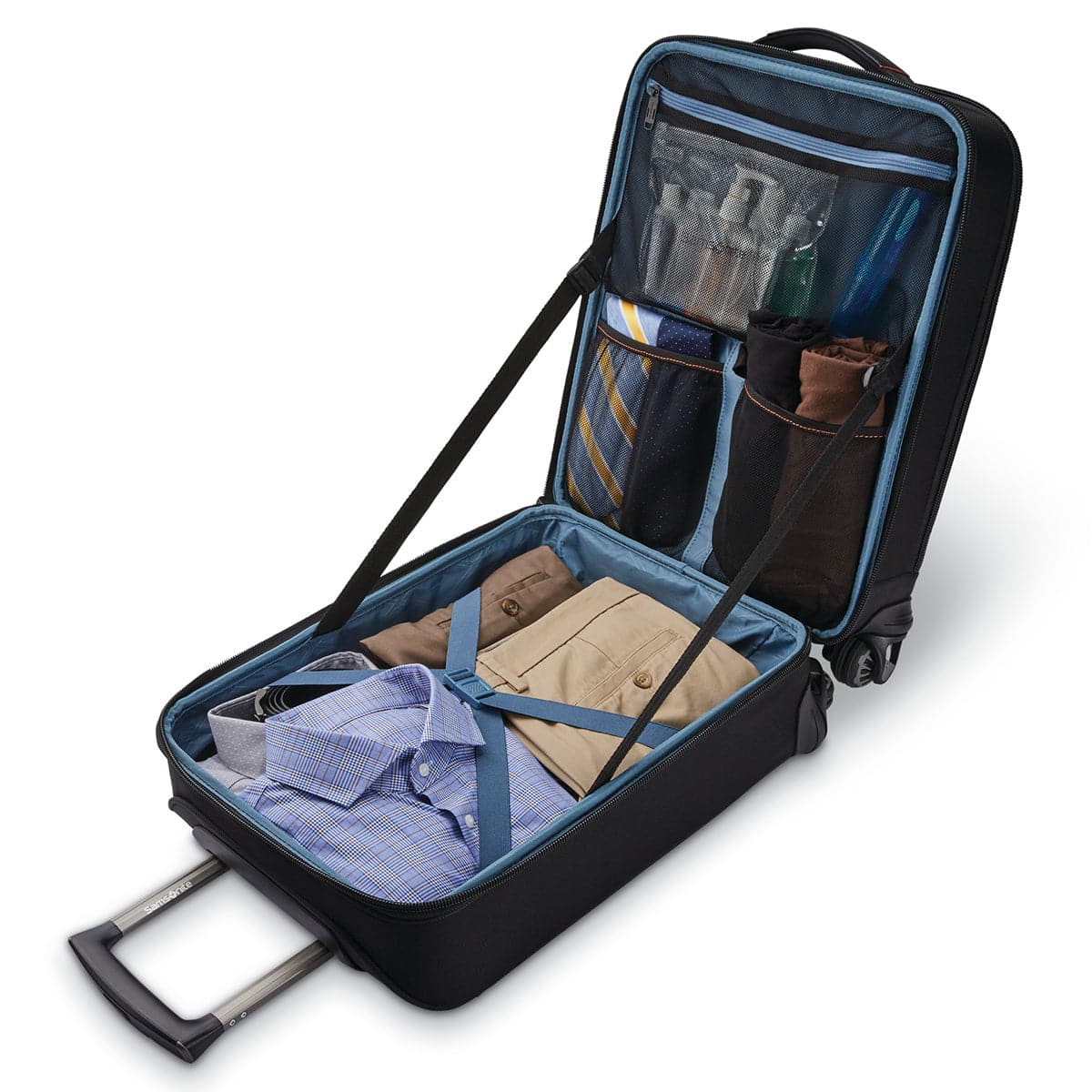 - Large Packing Capacity: Main compartment opens separate to business compartment for privacy and to lay flat for easy packing and unloading. Garment straps to secure and hold clothing in place