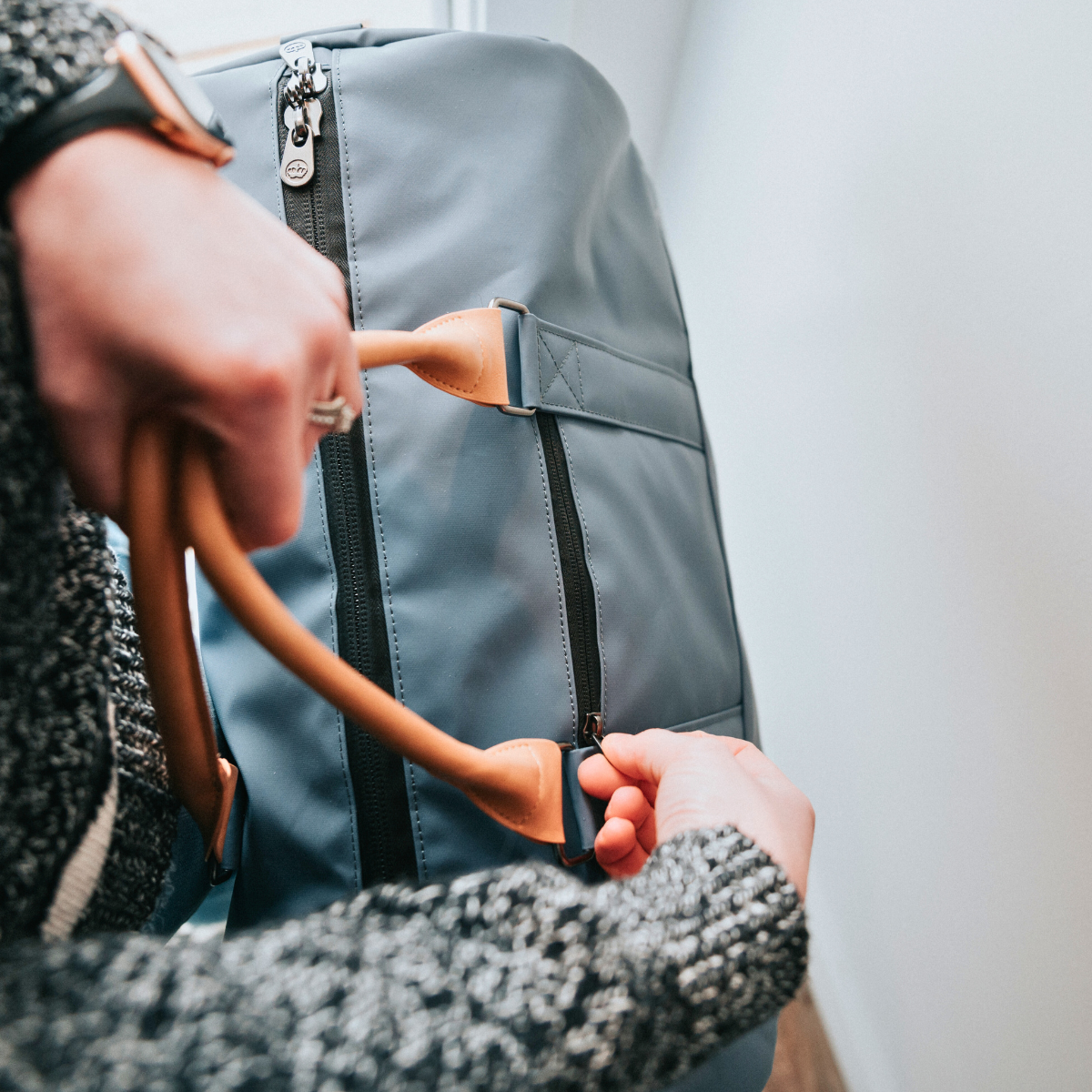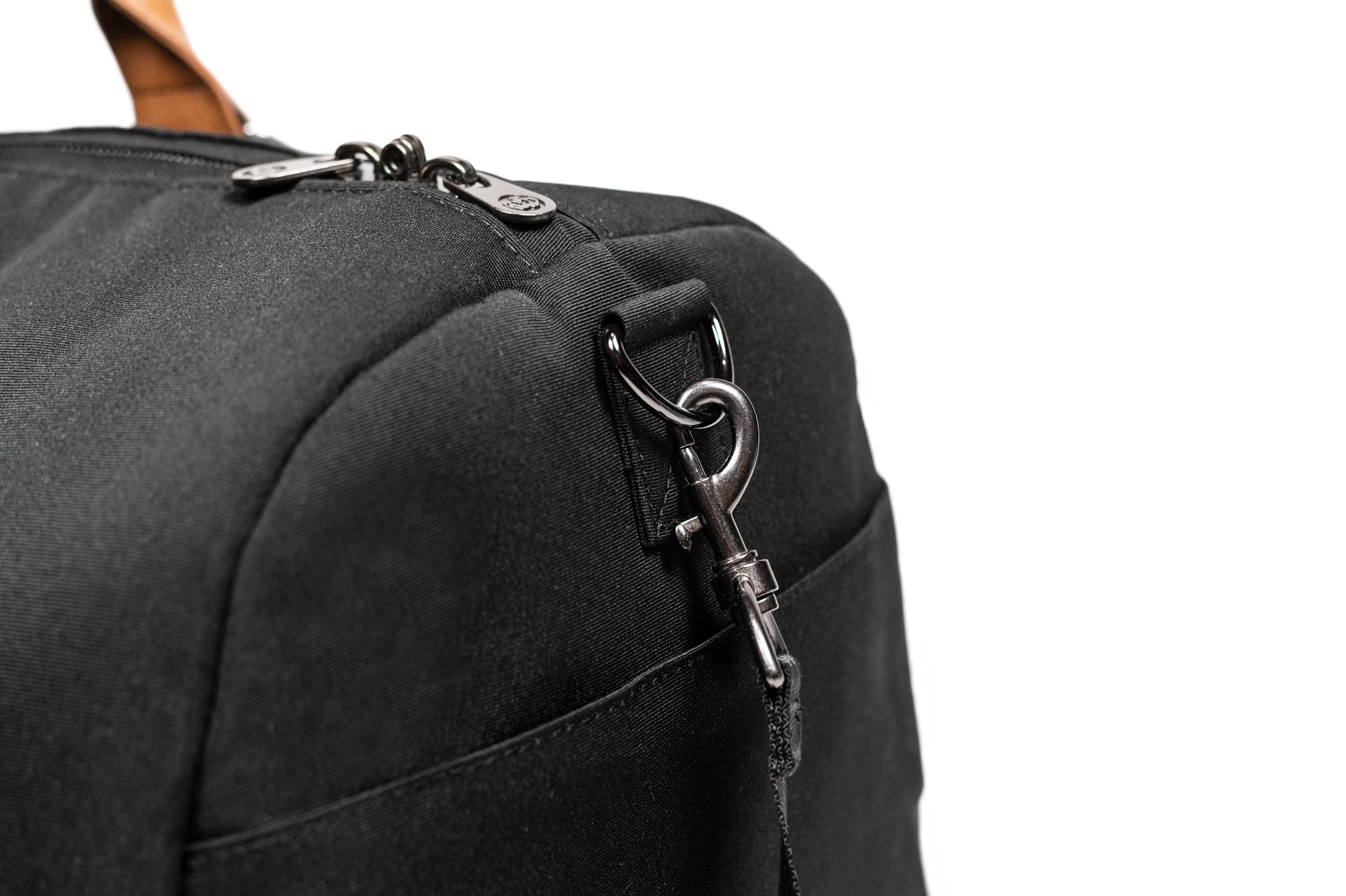 - Reversed main top zipper with lockable dual zipper pulls