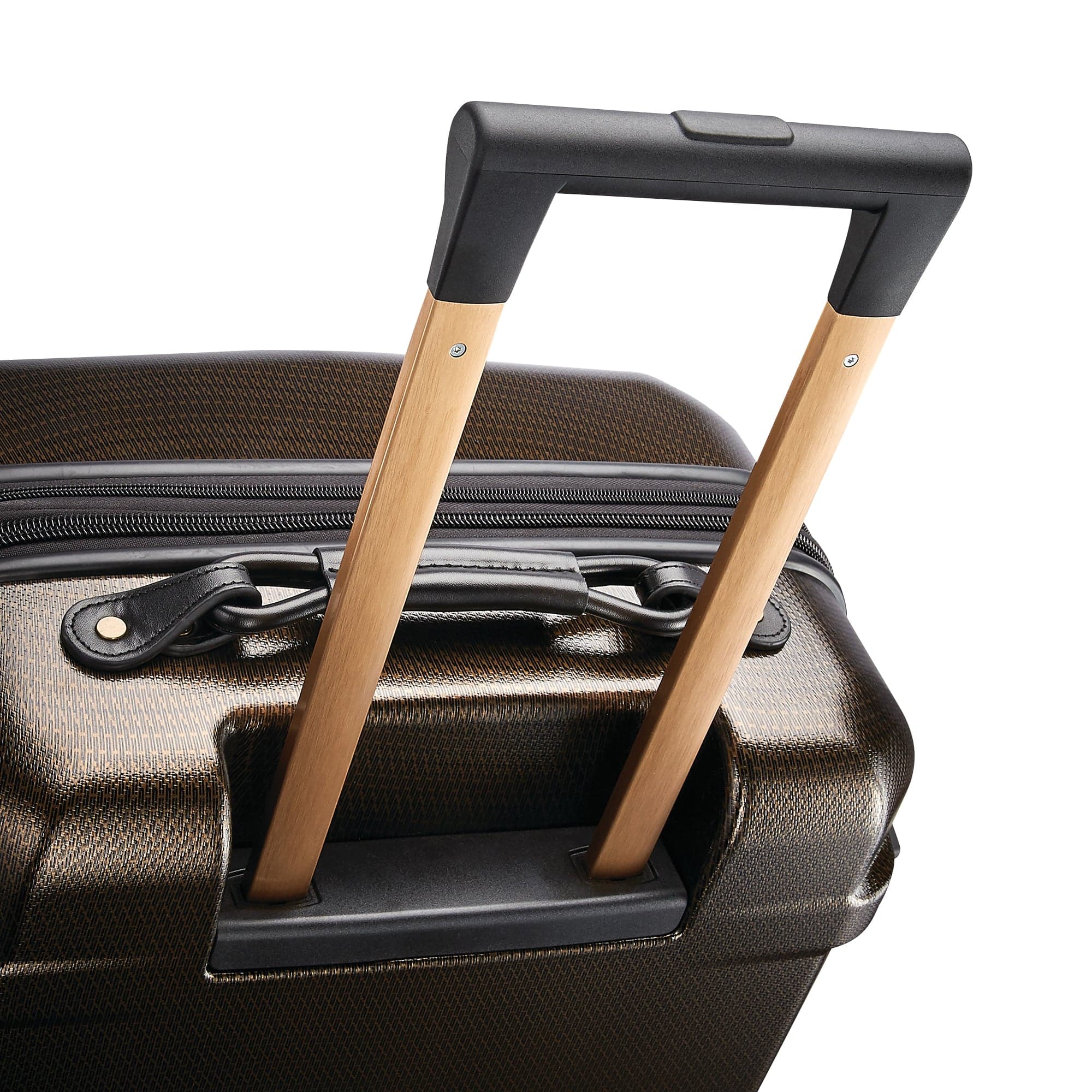 - Handles: Soft-touch, dual-stop pull handle with flush button for comfortable mobility, iconic leather-wrapped top carry handle