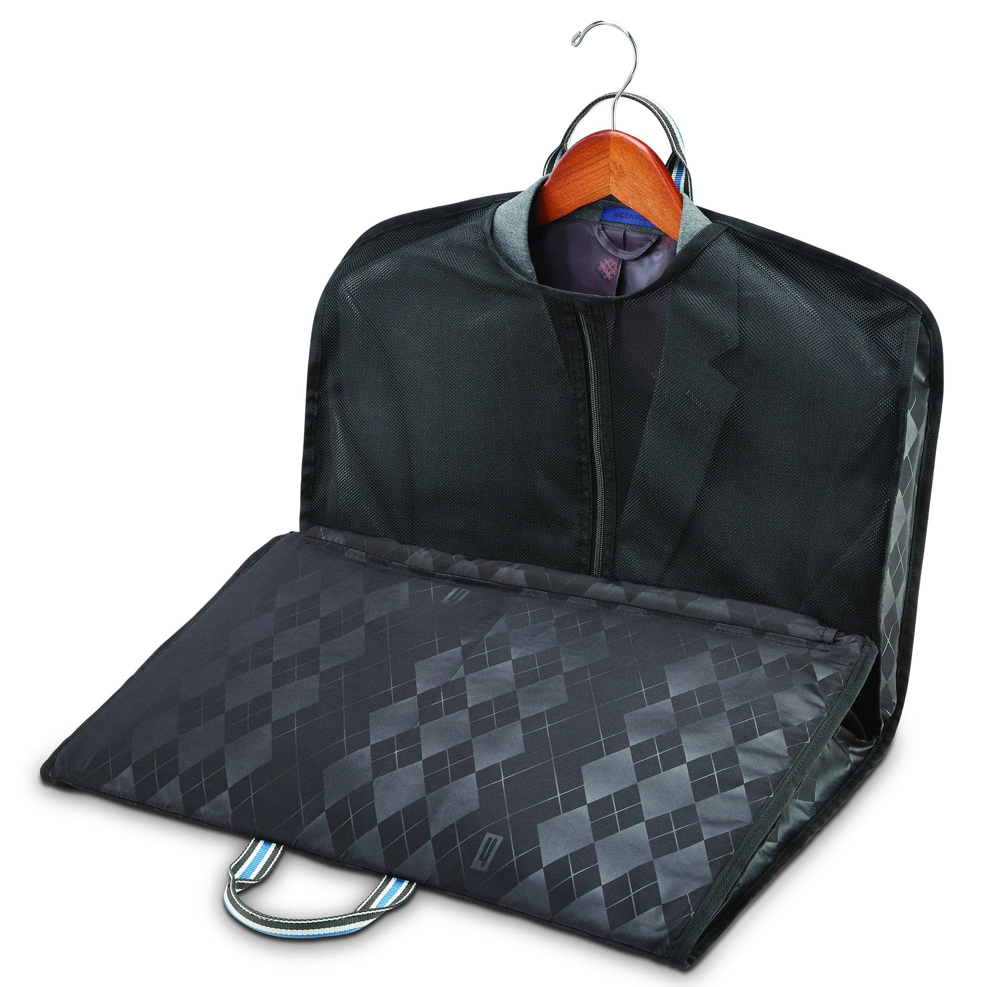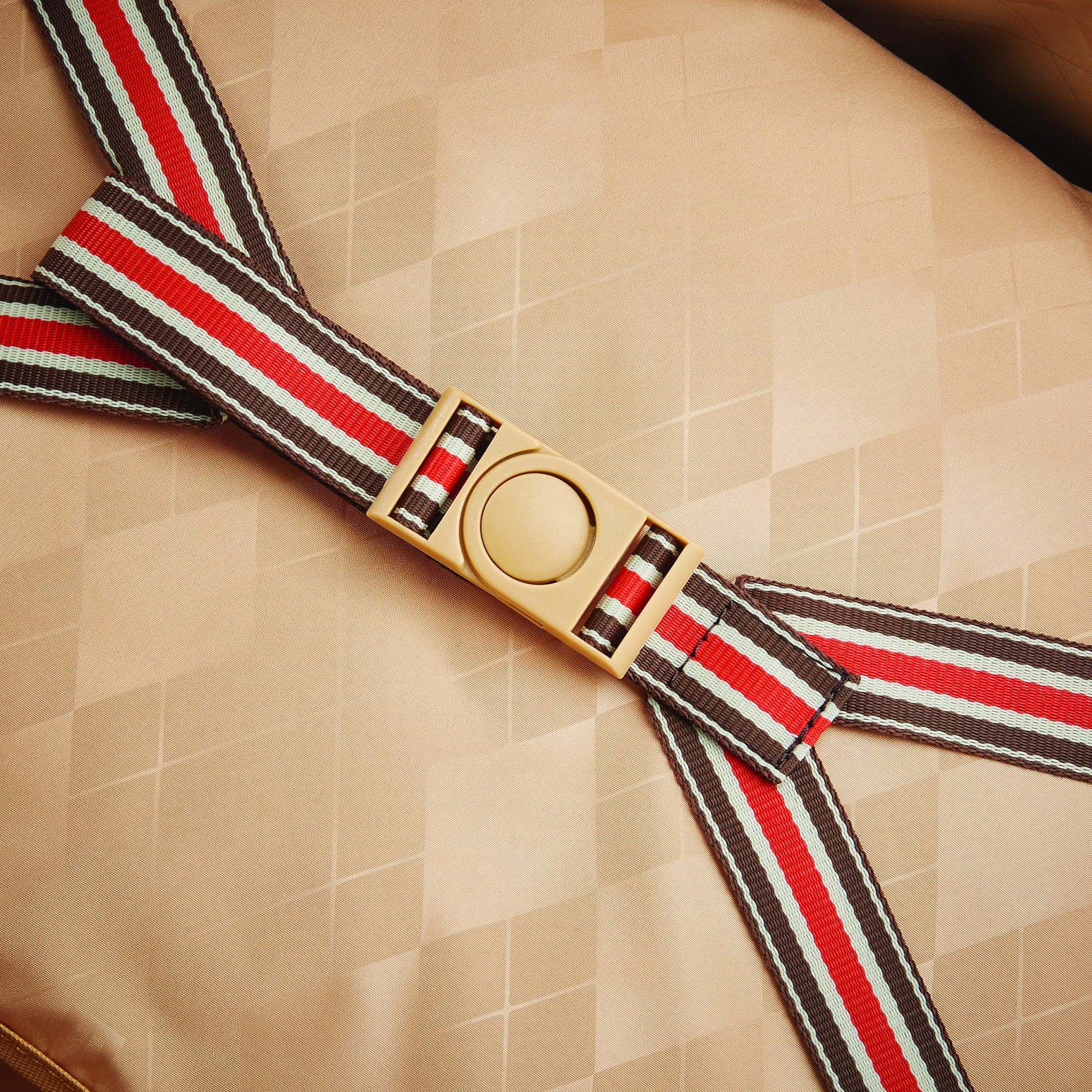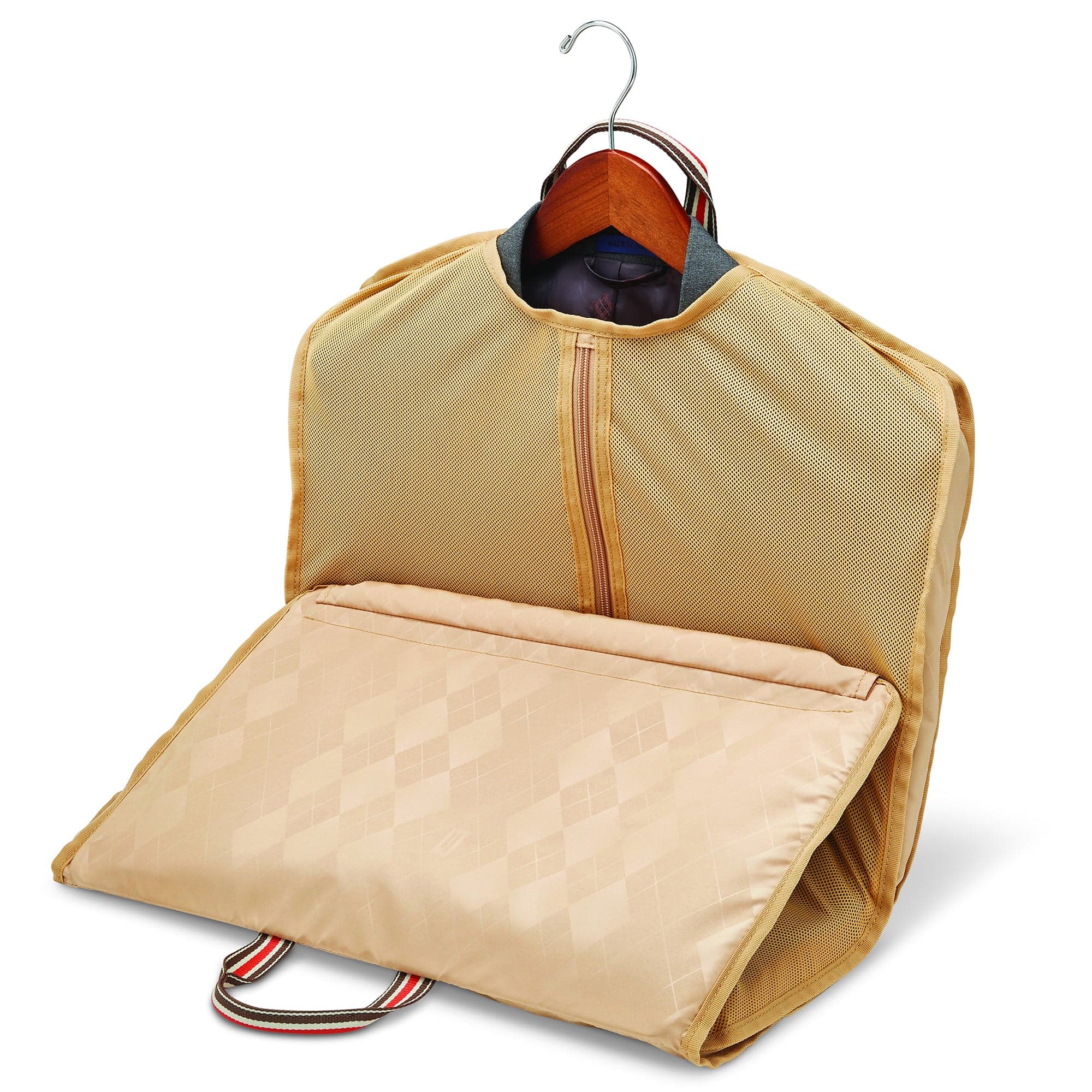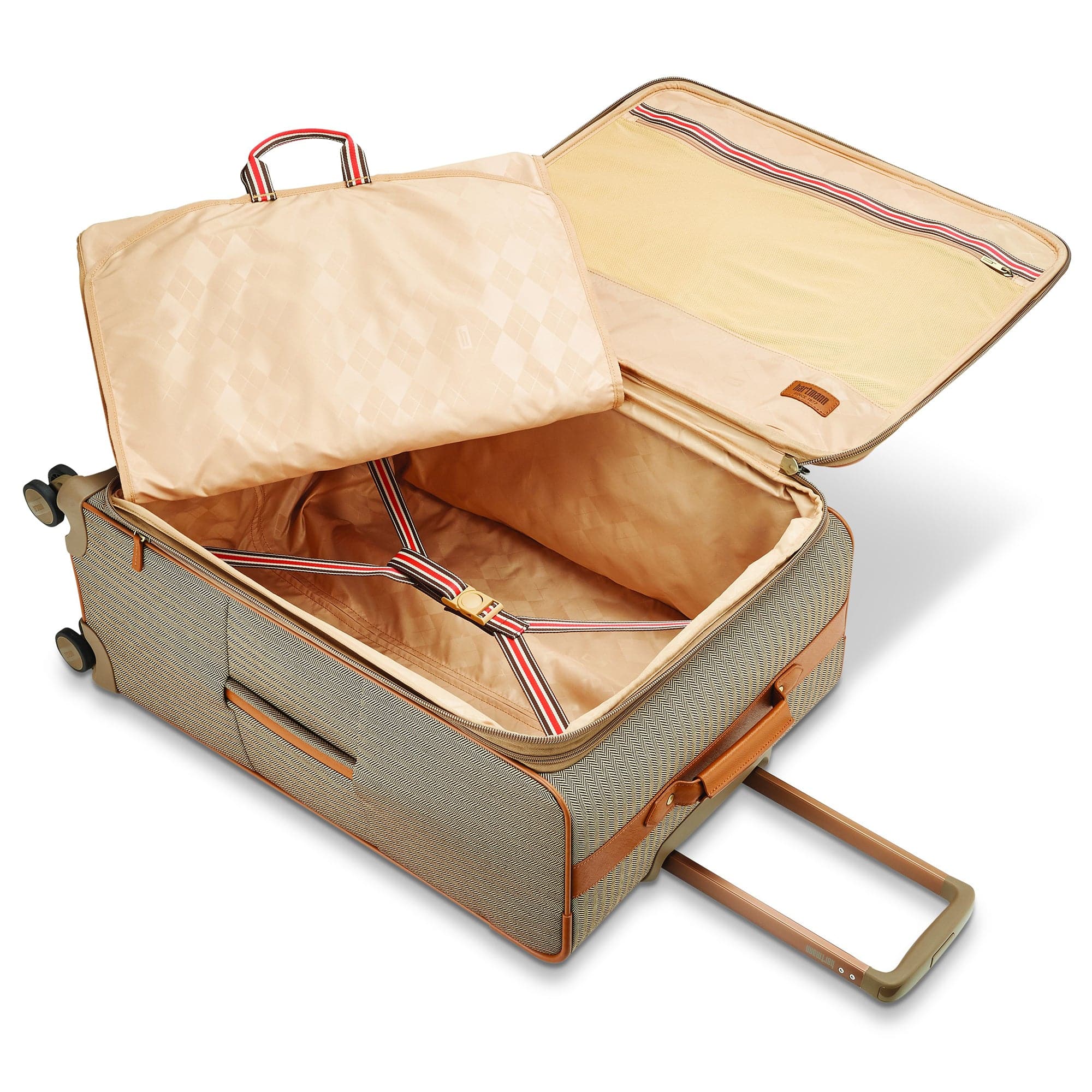 - Interior: Monogrammed lining with signature Heritage Ducord striped accents, spacious packing compartment with pockets for neat organization, padded tri-fold garment suiter, adjustable cross straps for keeping belongings secured