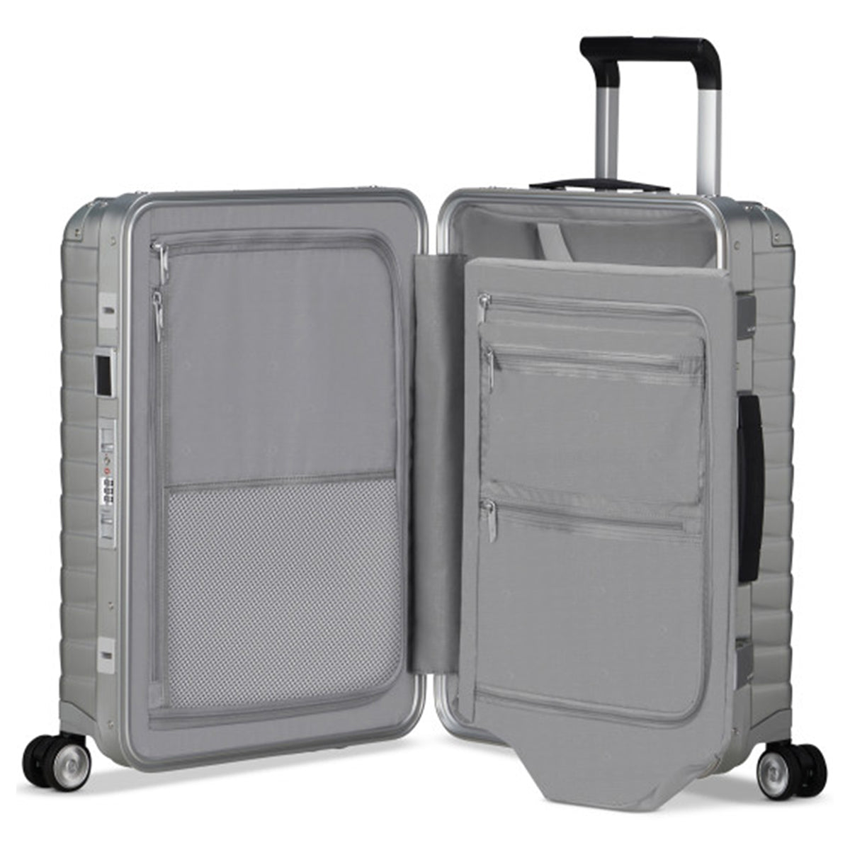 Dual tube lightweight aluminum handle 360° dual spinner wheels for effortless maneuverability on any surface Dual pocket divider Structure frame removable packing panel Adjustable compression straps Integrated TSA-approved lock No Anodized aluminum corner guards.